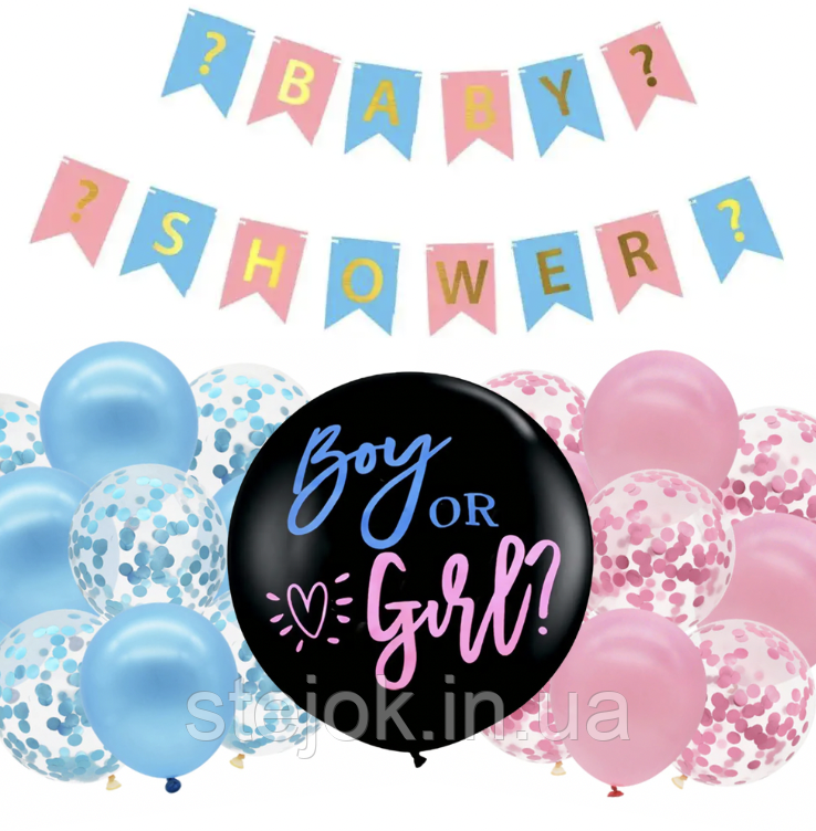 У комплекті: величезна куля з 2ма типами конфеті + гірлянда картонна + 10 куль латексних + 10 куль із конфеті