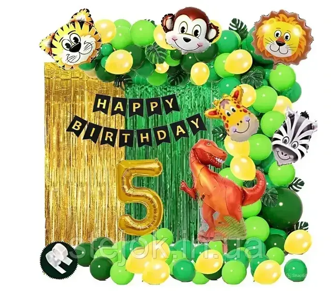 В комплекті: напис картонний "Happy Birthday" чорний - 1шт, фольгована цифра 80см золото - 1шт, фольгована куля Жираф голова 62*44см - 1шт, фольгована куля Лев голова 54*54см - 1шт, фольгована куля Зебра голова 62*44см - 1шт, фольгована куля Тигр голова 48*48см - 1шт, фольгована куля Мавпа голова 48*48см - 1шт, фольгована куля Динозавр помаранчевий 83*94см - 1шт, фольговані шторки 1*2м - 2шт (золото - 1шт, зелена - 1шт), листочки декоративні - 11шт, латексні кульки 26см: жовті #002 - 25шт, салатові #011 - 40шт, зелені #012 - 35шт, темно-зелені #013 - 23шт; латексні кулі 48см: темно-зелені #013 - 2шт; стрічка-основа для арки - 5м, гель точки - 40шт